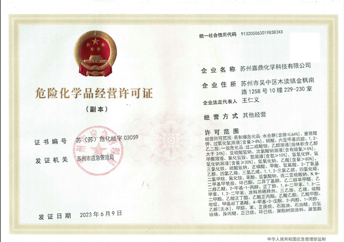 蘇州嘉鼎化學(xué)科技有限公司是一家專業(yè)高效、產(chǎn)品齊全的大型危險(xiǎn)化學(xué)品供應(yīng)鏈專業(yè)解決方案提供商,系蘇州化工行業(yè)協(xié)會理事單位,至今已有近十余年歷史。公司自有正規(guī)危險(xiǎn)品倉庫、危險(xiǎn)品車隊(duì)、化驗(yàn)室、并能提供第三方檢測機(jī)構(gòu)報(bào)告,可為終端使用工廠或貿(mào)易商提供有特殊要求化學(xué)品如中性標(biāo)簽、全新各類規(guī)格包裝、混兌、阻燃、無味、安全、環(huán)保、定點(diǎn)危險(xiǎn)品車配送等大部分公司不可滿足之服務(wù)。貴司只管接單,余下事務(wù)交由我們做。我司擁有華東地區(qū)多家大型終端工廠和一線品牌代理商配套合作服務(wù)經(jīng)驗(yàn),系華東地區(qū)化學(xué)品經(jīng)營規(guī)模化公司之一。誠信、專業(yè)、高效是我們的經(jīng)營理念,合作共贏是我們的終極目標(biāo)。 我們產(chǎn)品涵蓋有機(jī)溶劑、無機(jī)酸堿鹽、實(shí)...